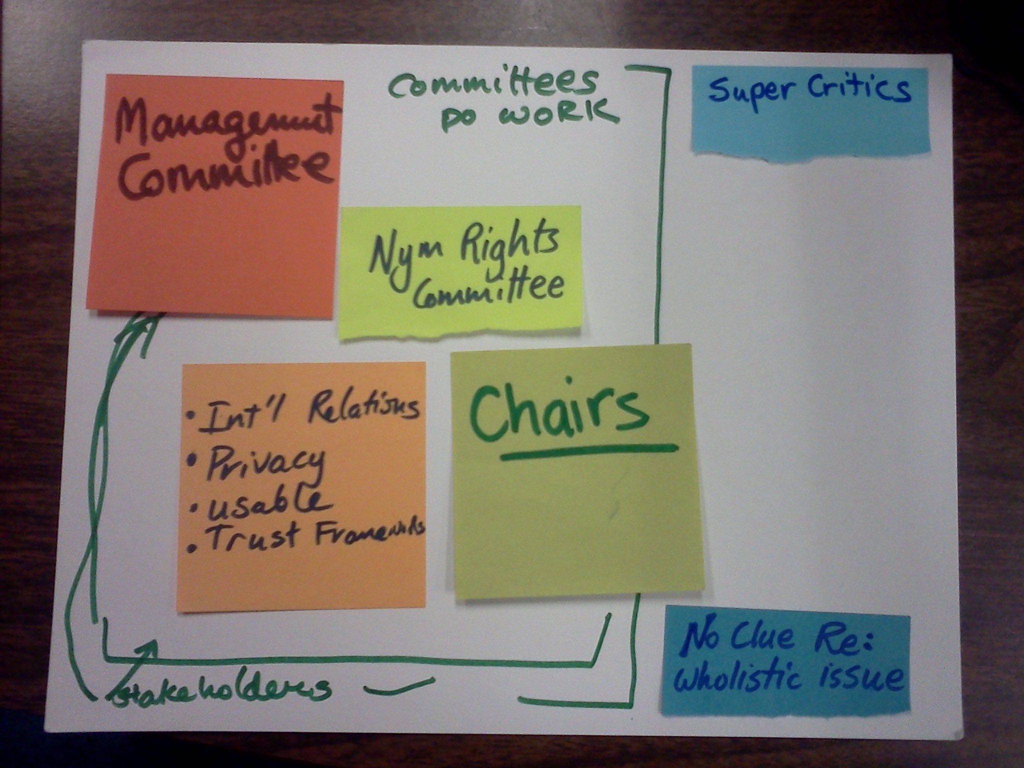 Thanks to the support of several people involved in IDESG (especially Bob Blakely), I was able to make the Phoenix IDESG plenary (large group discussion) for the first day. Thanks to interest from multiple parties (especially the Privacy Committee) we were able to have a four hour long discussion about NymRights and potential integration within NSTIC.